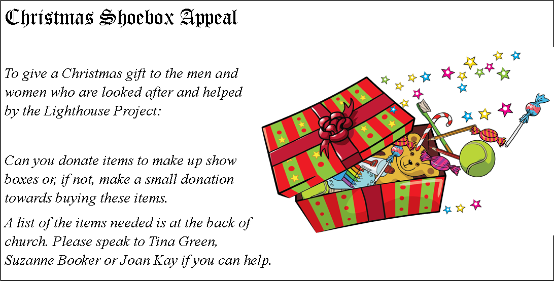 Surprise Parcel Stall: a new initiative this year. Please could you support this exercise by picking up a gift bag from the back of church; putting a 'gift' inside it and then returning it to the collection box in the lower meeting room. These will then be sold at the fair for £1 each.